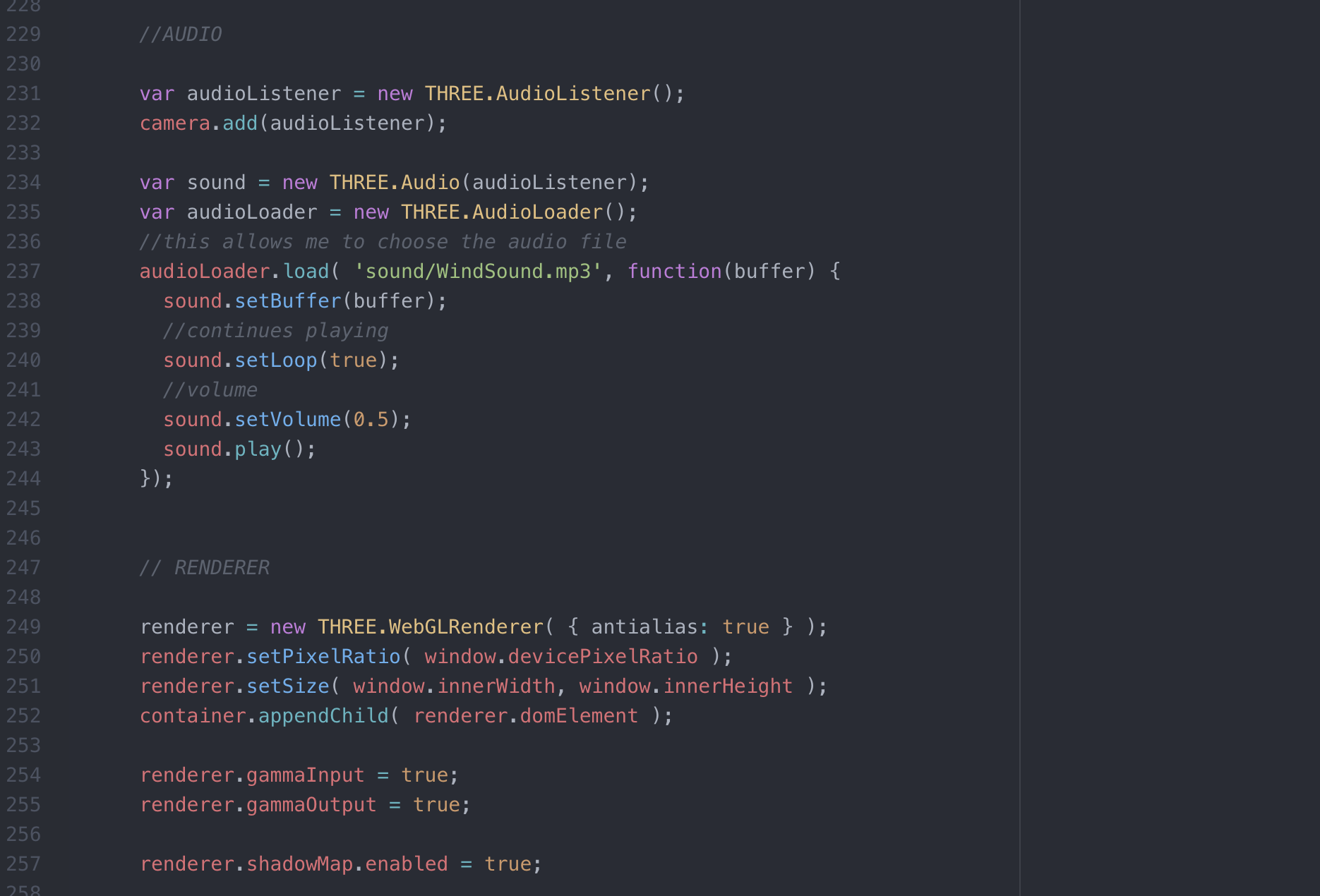 I added audio to the scene to add to the calming effect I hoped the whole code would help people feel, I ran into a few issues adding this, in the beginning code I had to add a mute button which does not fully work but it allowed the audio to work in chrome as it was a huge issue, this is also an improvement I would like to add in the future and given more time I will be able to play more and fix this issue. The set loop allows for the sound to go on for the entire time the user is veiw the scene and the volume can also be controlled through your computer but is set at a 0.5 setting as a pre set if you can not control it. The renderer functions allows everything to enter the scene and load up efficiently.
