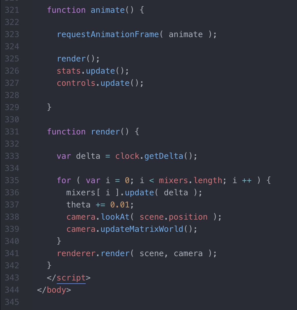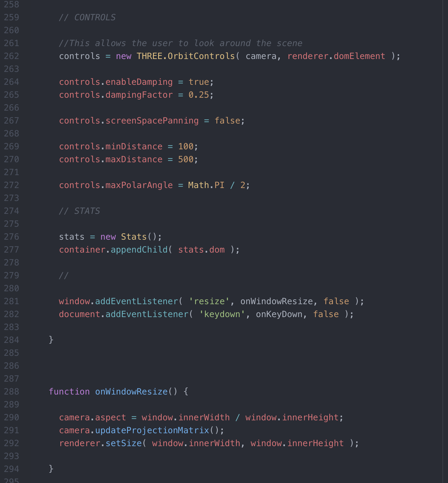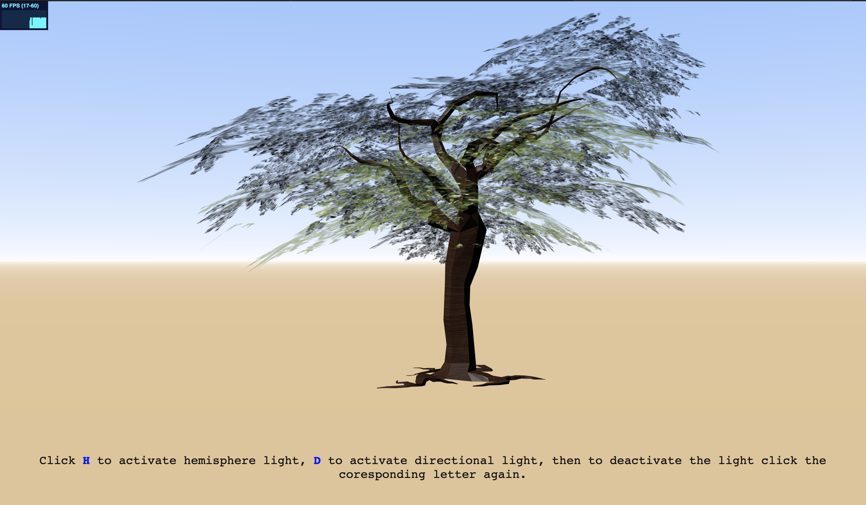 The panning allows the user to look around the scene, I set the miniamum and maxiamum settings so the user couldn't go too far from the tree but still be able to not see it at all if you just want to look at the scene background, there was a dampening effect also added to reduce the effects that may stop the occilation. The stats added to the bottom of the code help set the frames per second meter so you can keep an eye on loading time of the scene.