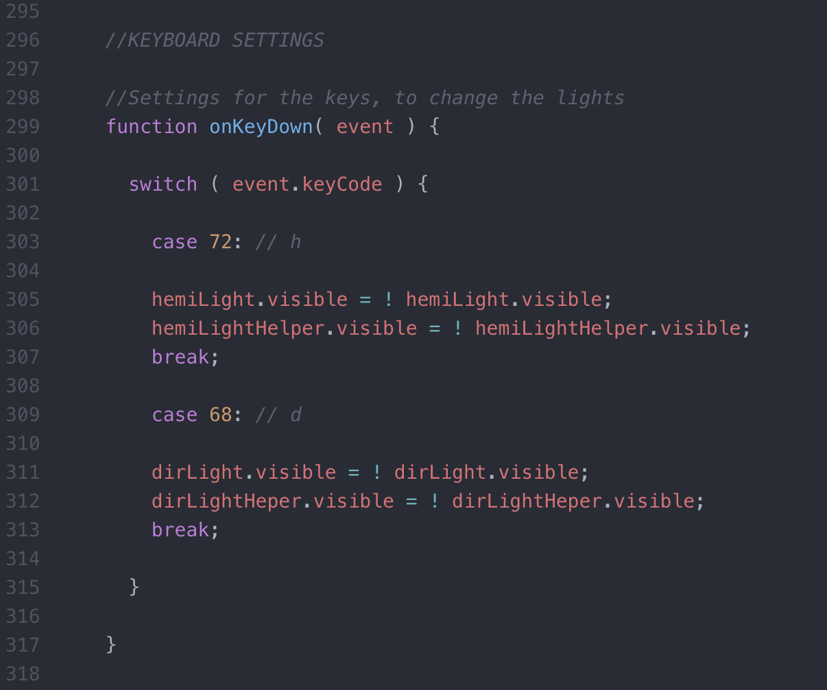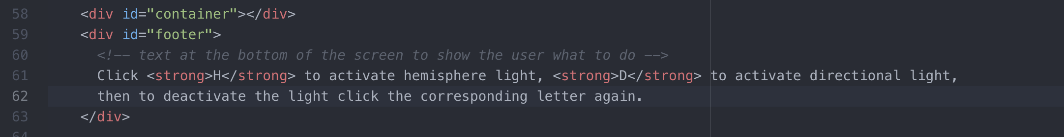 The biggest feature this scene has is the lights being able to change, I felt this would add to the calming effect as you could add the tone of light you wished to have, this needed buttons by using H which stands for the hemispere light and D for the directional light, this was capable by a key down function which called on the prepared functions already made for the lights. There was also a short paragraph added so the user knew what to do and how everything worked.
