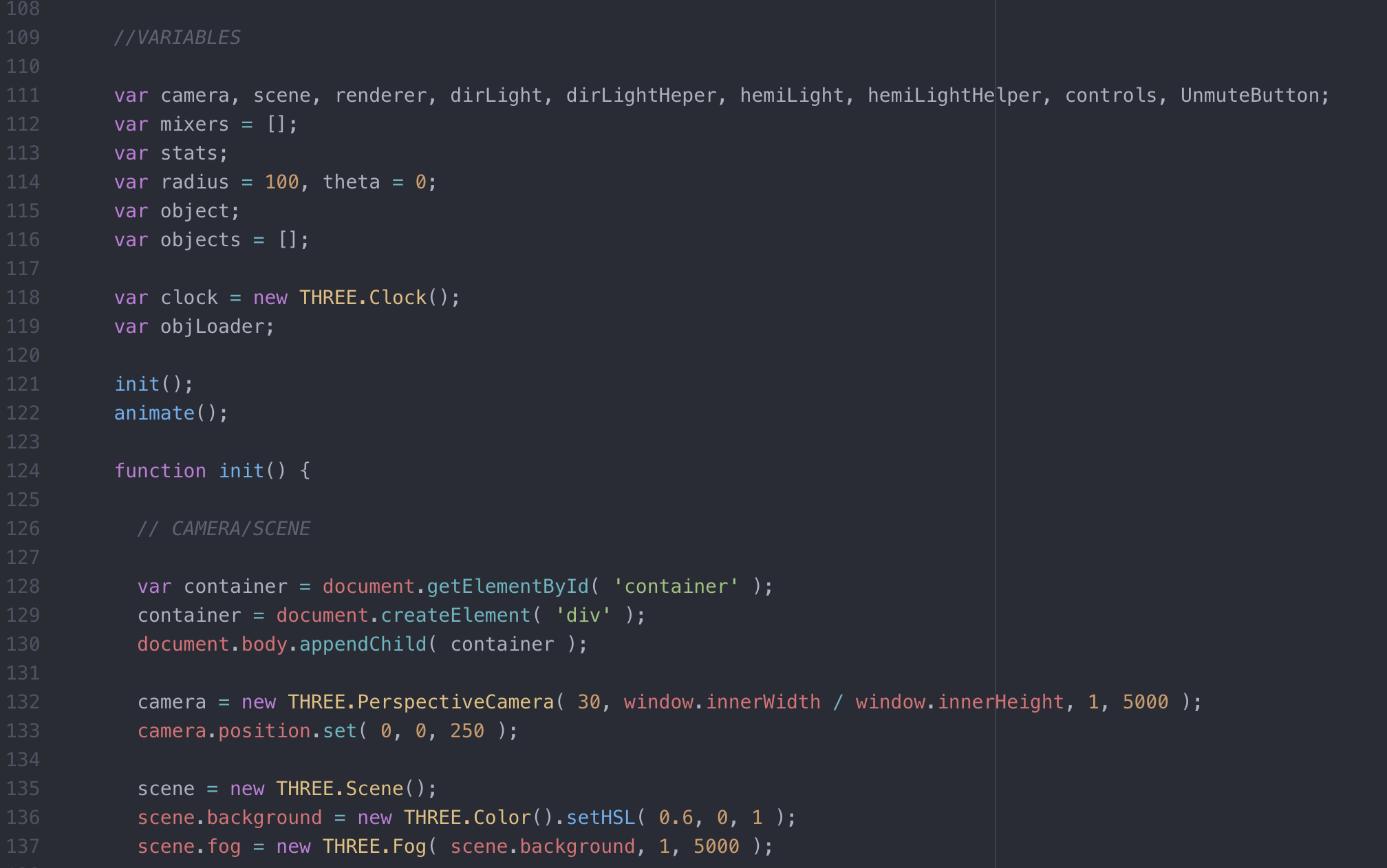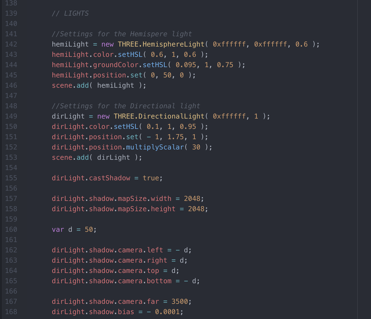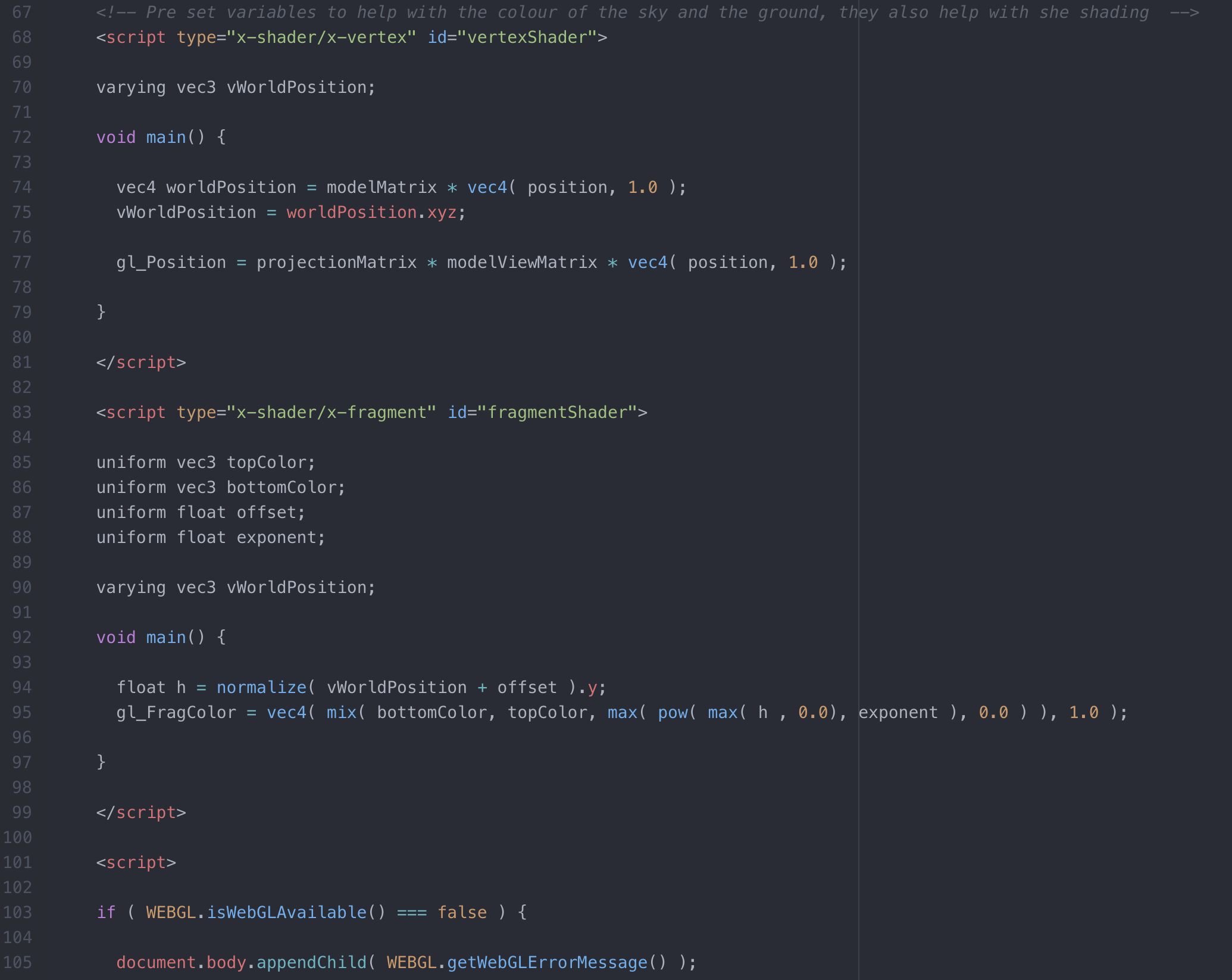 This shows how all the code started, this part of the code shows how it all starts, by adding in all the code that needs to be called on as well as every variable I want to programme. There are also Pre set variables these help set the hue of the ground and the sky and helps blend them to make that never ending feel to the background of the scene.