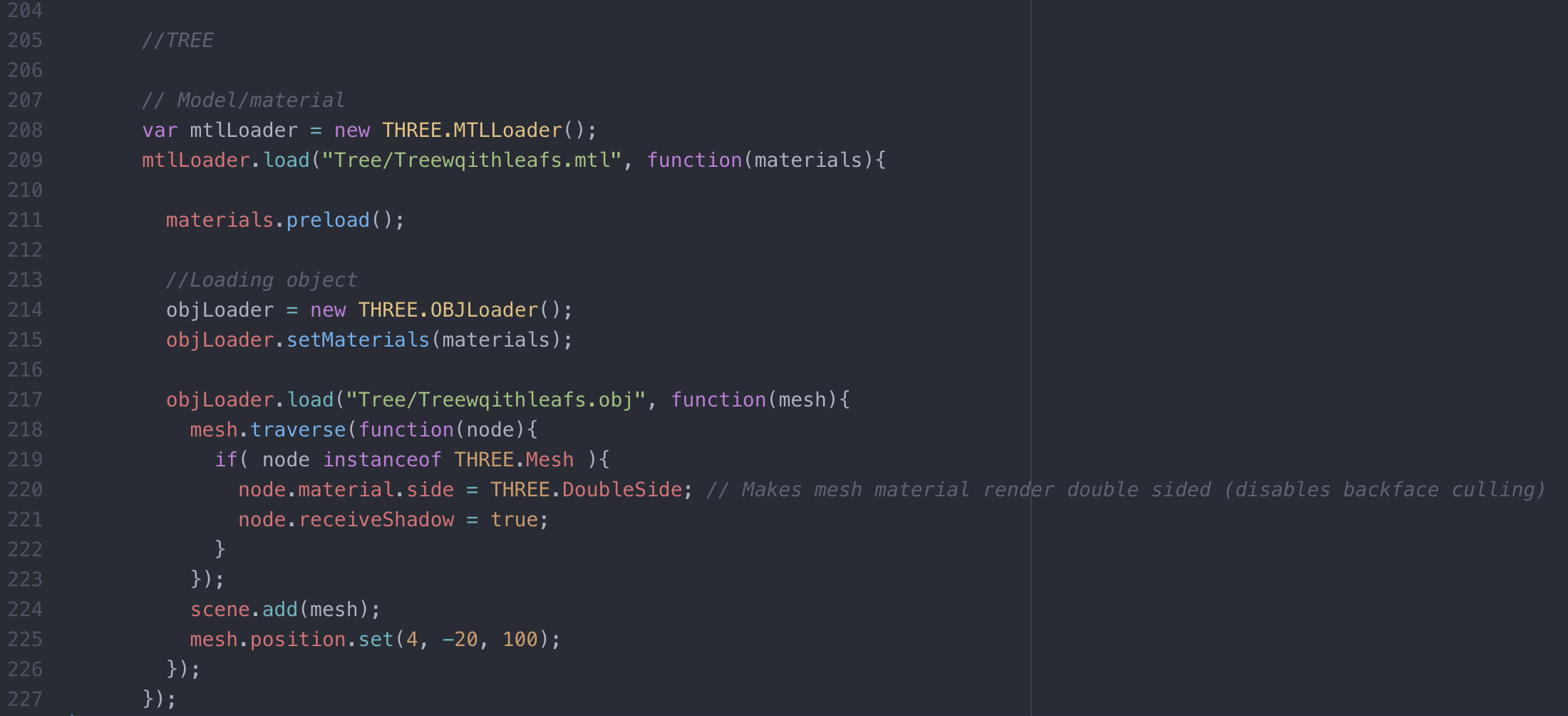 3D designing the tree was challening and fun, a lot of youtube was needed as MAYA the software I used was new to me but very rewarding with the finished product and I am proud of the outcome, I then got the tree to load in using the object loader as well as the material loader, three.js means that when you bring in an outside object to the pre programmed objects you need to include these loaders, you also need to still add the mesh as this is what will allow the object to fully appear on the scene. The leaves on the tree were the hardest part as they were already included in the material but I had to include the double side function as they were transparent to the light because of the angle they where set at.